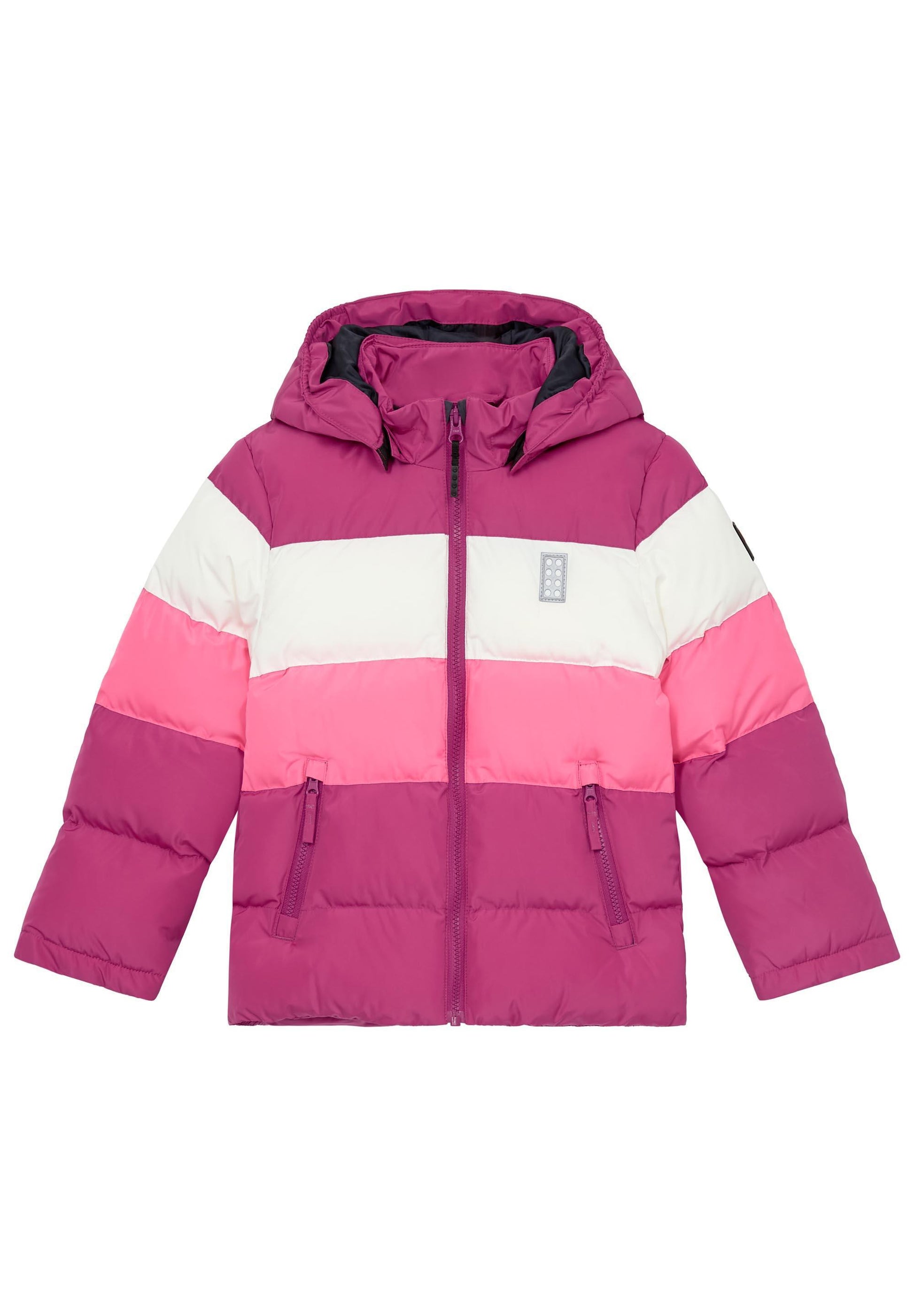 LEGO® Wear dynejakken har en aftagelig hætte, som sidder fast med trykknapper, og ærmerne har praktiske snefang med brede ribkanter.